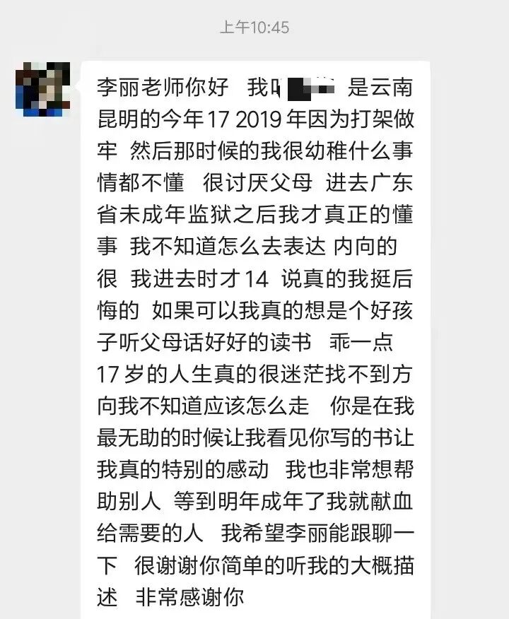 前两日,李丽中心的小助手丽小美突然收到一条来自云南昆明17岁姑娘的消息: