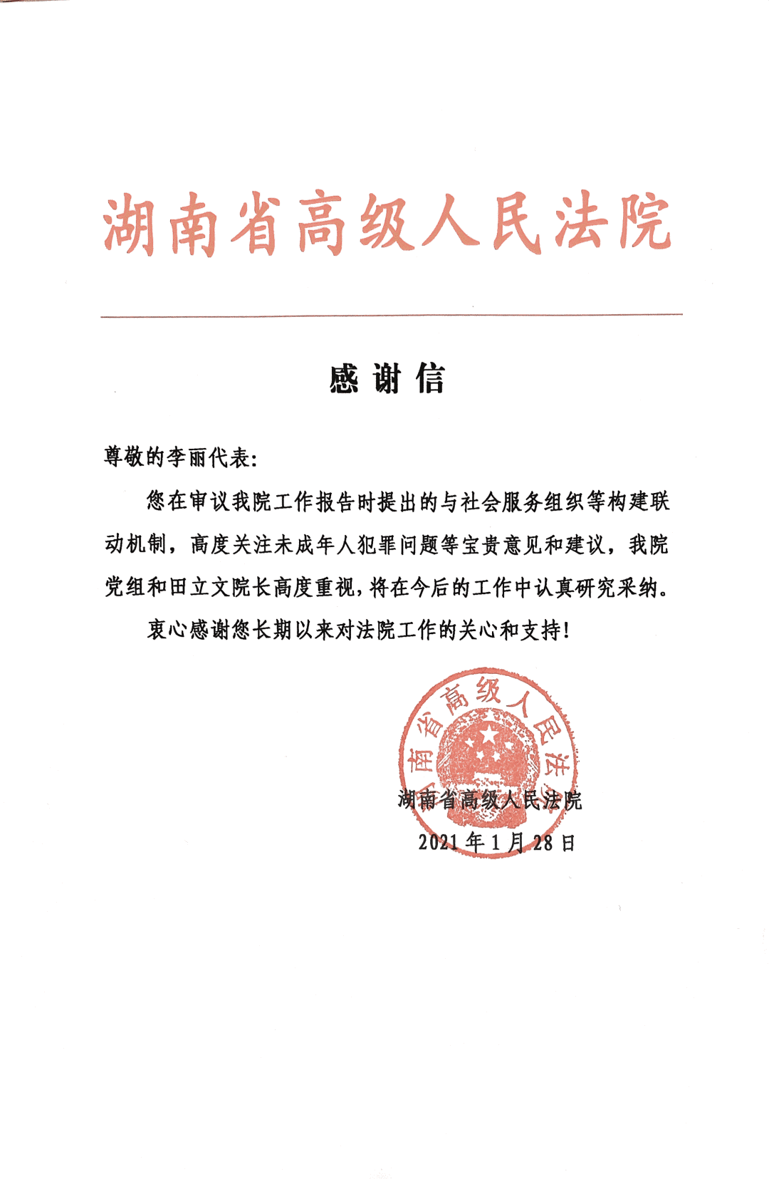 期间,李丽代表向湖南省高级人民法院提出“发挥社会组织专业优势,与法院建立联动机制,关注未成年人犯罪”等相关意见与建议,获得了省高院快速回应,表示将在今后的工作中认真研究采纳。