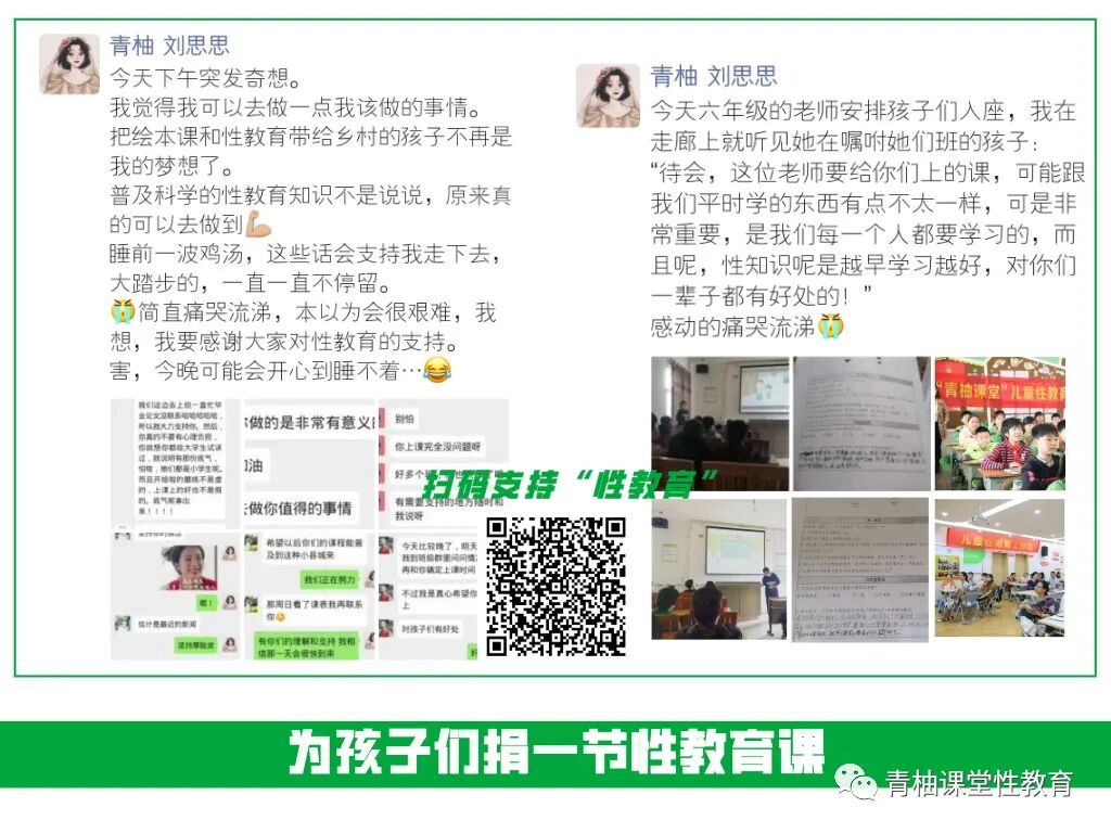 2020年4月26日至今,在疫情慢慢褪去的邵阳市邵阳县,有一个年轻美丽的身影在短短的几天时间内,将性教育课程带给了邵阳县城、乡村7所学校22个班级的464名孩子们,尽管她还只是一名大三的学子,却已经与社会融洽接轨,干着一件平凡而又伟大的事情。 她就是“青柚课堂”性教育讲师——刘思思。 2019年3月底,她报名参加青柚课堂的性教育讲师招募,历经一个月时间,参与项目线上线下性教育系统培训学习、练课试讲与授课实践,5月份通过最终考核,正式加入青柚课堂讲师团队。 事情是这样的...... 受疫情影响,大学生普遍滞留在家,思思老师也是其中之一。近期鲍毓明性侵养女、N号房26万人集体“性侵”等事件频繁爆出,一度成为网络热搜,引起大众的广泛关注,这也极大地激发了思思老师的社会责任感,作为一名性教育讲师,思考着能为家乡的留守儿童做些什么。 于是....... 她尝试着通过家人朋友和学校,联系可以授课的学校。从自己联系学校,到学校主动联系她,邵阳越来越多的学校知道有这么一位优秀的老师,可以为孩子带来专业的性教育课程。目前为止,她先后为邵阳市峦山学校、邵阳县五完小、堡口学校、五里完小、双联希望小学、合兴完小、下花桥镇中心完小7所学校,开启了家乡留守儿童的性教育的大门。 @青柚课堂 从前期的授课沟通对接、授课准备到授课总结,思思老师积累了丰富的实践经验,为了帮助更多的人了解如何更好地进行性教育,青柚课堂项目组特别邀请了思思老师进行线上直播分享。 【报名讲师分享直播课】 欢迎大家关注今晚的直播,进入直播间可直接点击以下链接进入,更多接地气的性教育实践经验等你来取经,也欢迎和我们一起探讨学习! 链接:https://m.qlchat.com/wechat/page/topic-intro?topicId=2000009650546639(复制链接到浏览器打开即可进入直播间) (也可扫描上方二维码,关注公众号即可进入直播间) “青柚课堂”性教育公益项目简介 “青柚课堂”性教育公益项目由湖南李丽心灵教育中心发起,致力于普及科学的性知识。通过培训专业性教育讲师,深入学校和社区,结合儿童性教育知识体系,穿插性教育游戏及动画播放,针对性地开展性教育主题课程,引导孩子和家长在互动中学习性教育知识,解决家长不好意思与孩子谈性,孩子不懂科学的性等问题,给予孩子科学和健康的性观念、性知识,引导孩子尊重他人、学会保护自己、预防性侵害。 —— End —— 文字/编辑 单子 图片/思思 点击阅读原文了解性教育