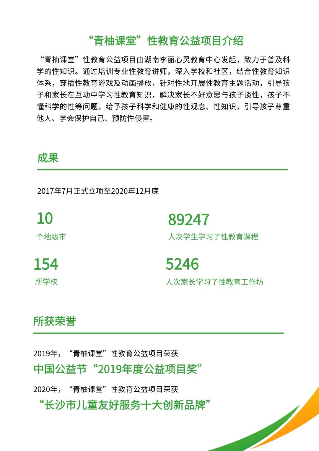 “青柚课堂”性教育公益项目由湖南李丽心灵教育中心发起,致力于普及科学的性知识。通过培训专业性教育讲师,深入学校和社区,结合儿童性教育知识体系,穿插性教育游戏及动画播放,针对性地开展性教育主题活动,引导孩子和家长在互动中学习性教育知识,解决家长不好意思与孩子谈性,孩子不懂科学的性等问题,给予孩子科学和健康的性观念、性知识,引导孩子尊重他人、学会保护自己、预防性侵害。