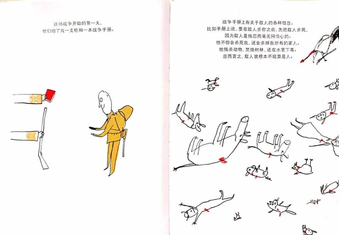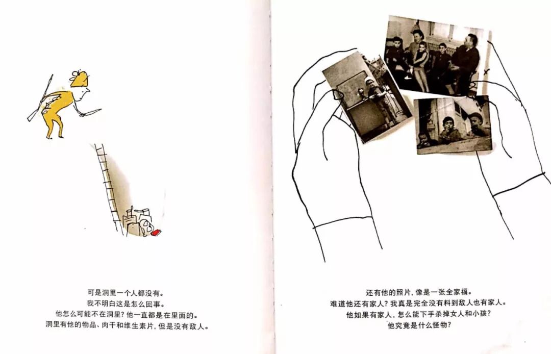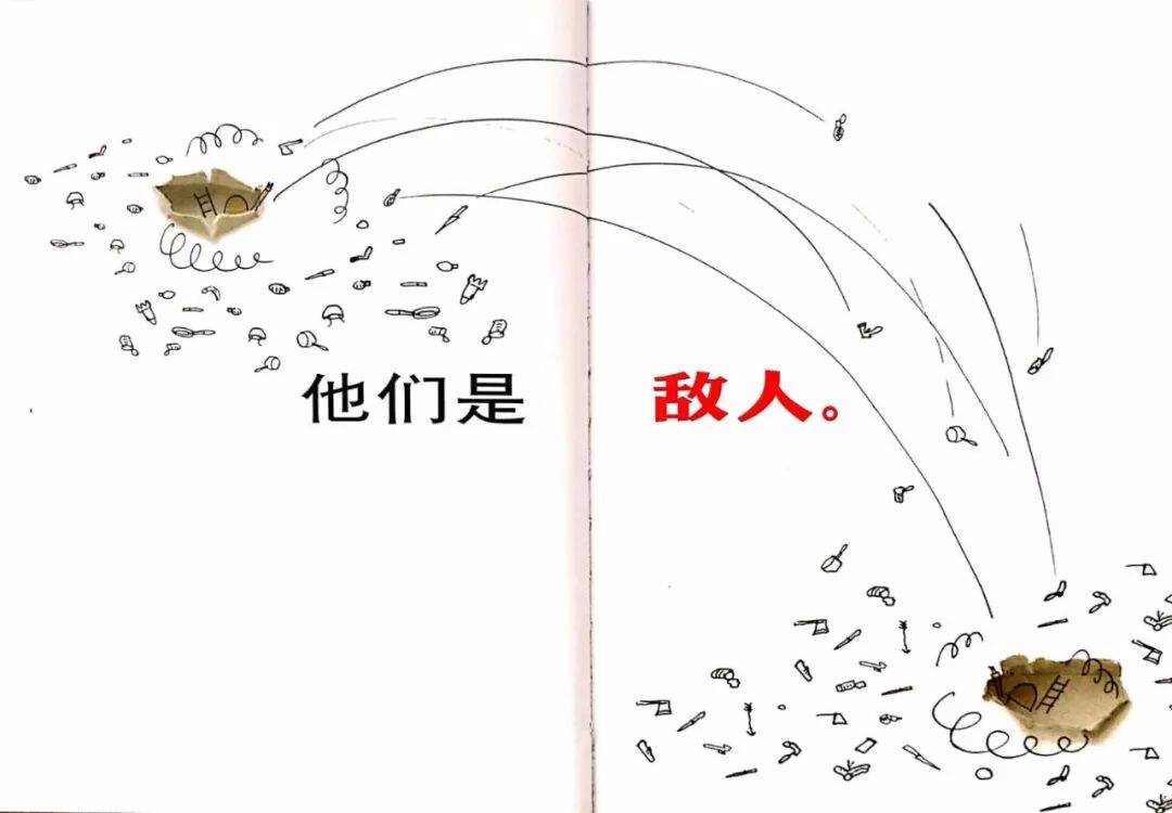 作者 l 陈丽 来源 l 开绘啦(ID:kaihuila2018) 转载请联系授权(微信ID:zombie719) 战争与和平,是个很大的话题。如何向孩子讲述战争?如何建立孩子对和平的追求?似乎很难。 然而,有一本绘本,以一个荒诞又极具吸引力的故事,向孩子们打开了一扇门,使他们从一种最深刻又最简单的角度来认识战争的本质。 这本绘本就是《敌人》。无论是儿童还是成人,一打开这本书,都会被它吸引,要一直读下去。 1 绘本简介 绘本的封面是一个神气十足的军官。他身材高大、魁梧,几乎占据了整个封面的位置。他的军服上挂满了各种各样的荣誉勋章,展示着他的赫赫战功。他戴着墨镜,露出得意的笑容。而他正在敬礼的那只手,以及垂在一旁的另一只手的指尖,赤红的鲜血正滴滴下落。 翻过封面,迎面而来的是无数穿着军服、抗着机关枪的士兵,向我们揭开战争的场面。 然而,这本绘本所展示的并不是恢弘的战场,而是在一片荒凉的土地上,孤单的洞里的一个士兵,以及他的敌人。 整本绘本的图画十分有特色。与大多数色彩鲜艳、构图丰富的图画不同,这本书大多都是以白色为底色,配以手撕纸(士兵所驻守的洞)、植物贴画(荒凉的土地)以及简笔画的形式,向我们展开这个敌人的故事。 一个士兵带着上级发的战争手册驻守在一个洞里,想要快点歼灭藏在另一个洞里的敌军的士兵,好快点回家,和亲人团聚。 他的战争手册告诉他敌人是怎样的邪恶,毫无人性,残忍如野兽。是敌人开始了这场战争!而他,是为正义而战! 士兵的战争手册 可喜爱仰望星空的他知道,战争是毫无意义的,他想快点结束这场战争。于是,他冒着危险在夜里爬到敌人的洞里,想要干掉敌人,结束这一切。 然而,让他意想不到的是,敌人不在洞里,而洞里竟然有敌人的妻子、儿女的照片。 整本绘本中,所有的人物、场景,几乎都是寥寥几笔线条所构成。只有此时士兵所看的他敌人的家人照片,是真实的人物图片。 一张照片是一个小孩坐在妈妈的腿上,两个男孩和爸爸坐在椅子上,一家人围坐在一起。虽是黑白的照片,可仍然让人觉得温馨。 另一张照片是三个小孩倚靠着围墙吸烟的情景。这一定是个让父母又好气又好笑的场景吧。 还有一张照片,是一个小男孩的单人照。他戴着眼镜,捧着一本书,天真可爱。 敌人的战争手册 这些照片让士兵觉得非常惊讶。他没有想到,敌人也有家人! 并且,敌人有一本跟他一模一样的战争手册。唯一不同的是,那本战争手册上描述的敌人竟然就是他的样子!他看到,敌人的手册里充满了谎言。而正是因为同样的谎言,他来到战场,要杀掉那些“毫无人性”的敌人,而忘记了,“敌人”首先是“人”。 这个故事很滑稽。可真正滑稽的是什么呢?是士兵还是战争?是什么遮住了人的眼睛,让人看不见“人”,而只有如野兽般存在的“敌人”?或许,真正的敌人,正是人类永无止尽的私欲罢了。 他知道,敌人此时也去了他的洞里。后来,他扔出了一个塑料瓶,里面写着希望停止打仗的讯息,希望这个瓶子能掉进敌人待的洞里。而画面展示,敌人也向他扔出了一个同样的塑料瓶。 故事到这里戛然而止。他们有没有拿到对方扔出的塑料瓶?若是拿到,会怎么想,怎么做?会相信对方求和的意愿吗吗?还是仍然心存戒心,不敢放下手中的枪?战争能停止吗?这些问题留给了读者。 而绘本的封底,画着一个士兵,他闭着眼睛,坐在地上,嘴角弯着,口里叼着一片四叶草,一副安静、舒适的样子。这安静的画面,与故事中的紧张、焦虑、痛苦与煎熬形成鲜明的对比。而这样的生活,正是每个人心之所愿吧。 2 亲子阅读建议 父母在陪伴孩子阅读绘本时,不止是读字,也要读图。从封面开始,可以让孩子来观察图画。图画上画了什么?有什么特别的地方?为什么要这样画?可以通过这些问题来引导孩子观察与思考。 比如,在带孩子来看这本书的封面时,可以提这些问题: “封面上画的是什么样的人?” “他的动作和神态是怎样的?” “你猜他现在的感受是什么?” “为什么他的手上会有那么多血?这是谁的血?” 通过读图与问题讨论,孩子有机会去体会到绘者通过图画想要传达的内容。那么,绘本就不单单是一个好听的故事,而是孩子与作者之间的接触与对话。 另外,读图对于培养孩子的观察能力、思考能力、表达能力,以及情商的培养都是极有利的。因此,建议爸爸妈妈在带孩子读经典绘本时,可以放慢速度,带孩子细细品味。 让孩子做角色扮演,把自己当做故事中的那个士兵,让孩子尝试以第一人称的方式来讲述这个故事。然后再来问孩子的体会。 通过角色扮演,孩子会更深刻地体会到那个士兵所面临的紧张、焦虑、恐惧、孤单、饥饿、对家人的想念,体会战争带给人的痛苦。 大一点的孩子,可以藉此故事训练其批判性思维。 可以问孩子: “那个士兵是怎样有对他的敌人的那些看法的?” “这些对敌人的描述是否是真实?” “这些不真实的描述是怎样影响他对待敌人的?” “在我们的身边,是否有类似的事?” “你是否经历过因为一些人说的话形成对人或事的偏见?” “怎样可以避免这种偏见?” 不止是当时的提问,在生活中,也可以结合这本绘本来引导孩子,帮助孩子拓展思维,得以从多角度来看待问题。 有一次,我带孩子们在公园玩。哥哥看到一只背上有十几个点的瓢虫,就对妹妹说:“这是害虫!”妹妹一听,立刻就跟着说:“害虫!” “害虫”
