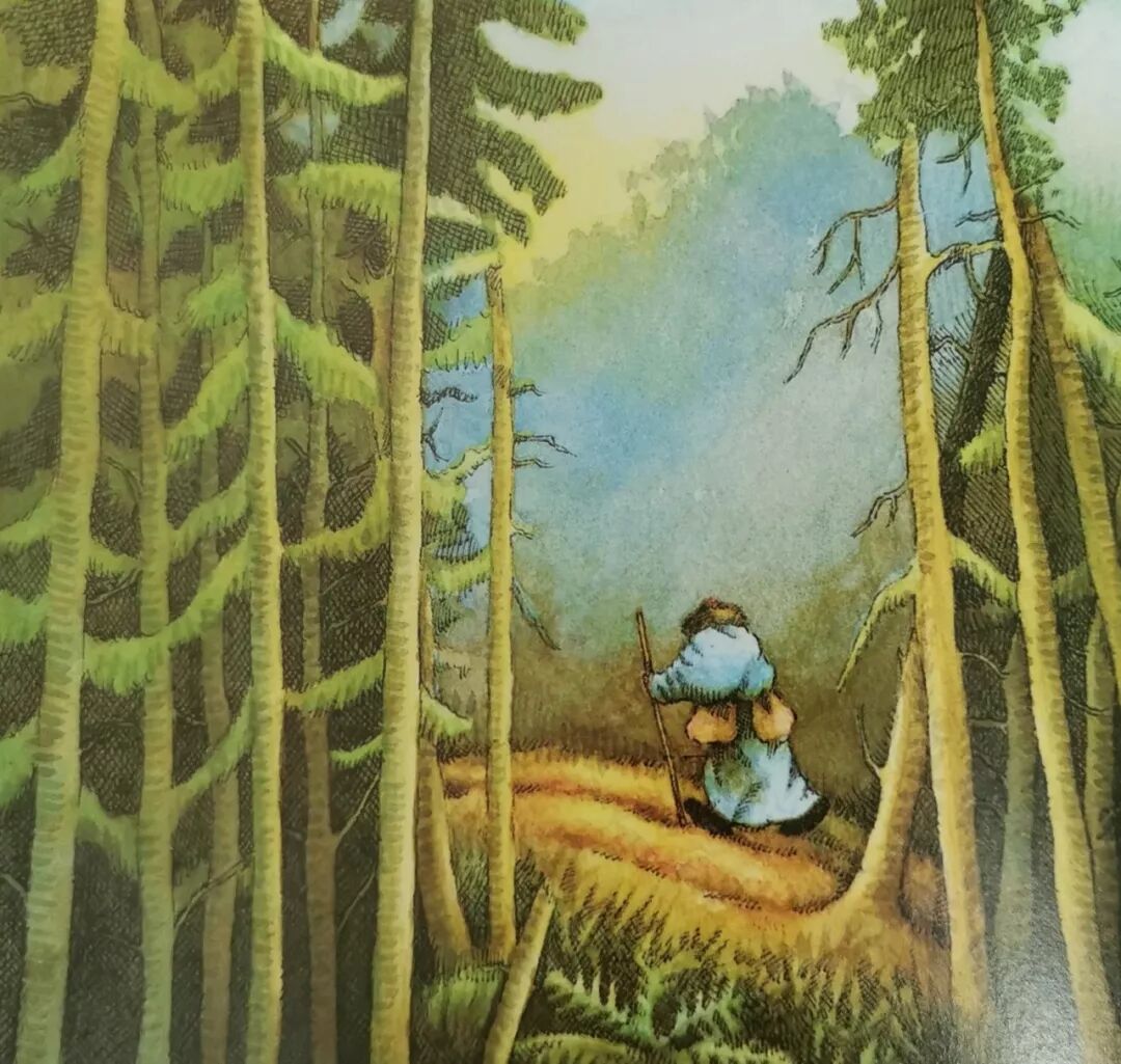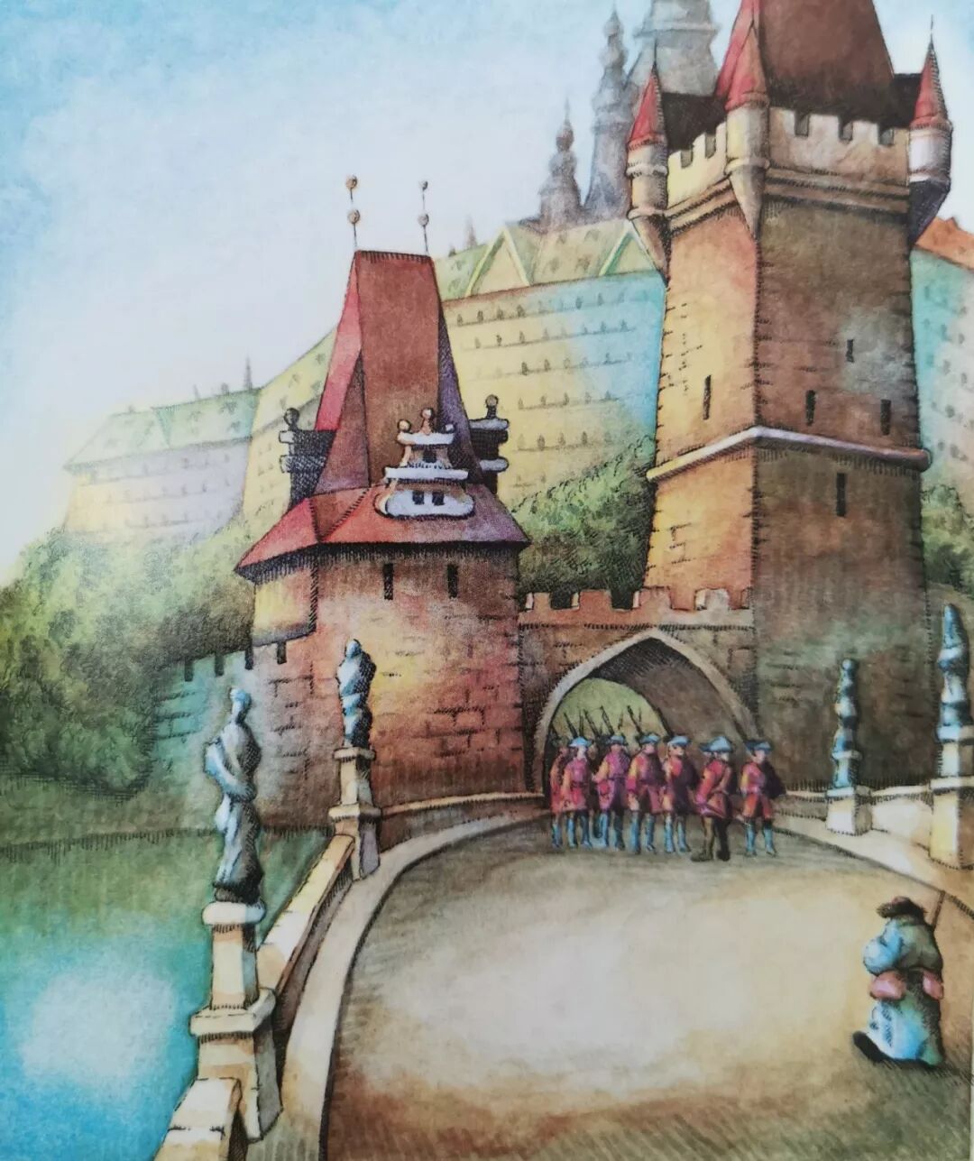 艾萨克上路之后:“偶尔,有人会让他搭车,不过大多数的路都得靠他自己走。他走过了一片片森林,翻过了一座座大山,终于到达了京城。”看上去很辛苦,大多数的路都得靠他自己走,又是森林又是山,可是他还是到达了。还没有那么简单,他来到皇宫旁的那座桥,发现白天黑夜都有卫兵把守,他不能靠近去找宝藏,只好天天在桥边转来转去。