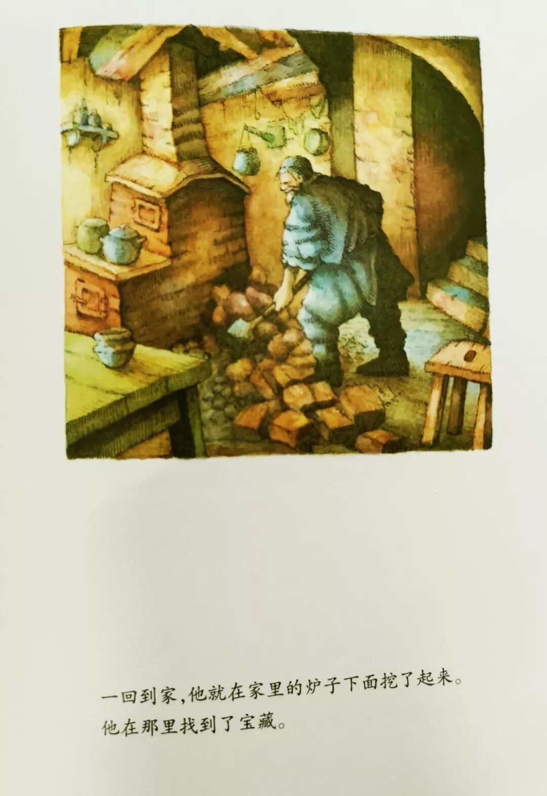 好的寓言、好的故事、好的小说,当它描述一件事情,总是以小见大、深入浅出,“一件事情”有时就是“一段人生”。要深读故事,一定要站在真实生活的视角去看故事里的“一件事情”。“偶尔,有人会让他搭车,不过大多数的路都得靠他自己走。”我们的人生路上,其实就是这样,偶尔有人会在你艰难的时候帮你一把,大多数时候,大家只能顾好自己,这是常态,大多数灰色的日子,得我们自己熬过去。当你好不容易越过一道坎,可能又会发现,原来“成功”没有那么简单,又有新的难题等待着你。这就是人生。这似乎太“深刻”了,年纪轻轻的孩子,怎么让他明白呢?其实不必让他说出什么“大道理”,只要给他列举一些生活小事,比如:上兴趣班,爸爸妈妈给他报名,老师教他技巧,练习和坚持都要靠自己。引导他发现生活中一些小规律,就可以帮他养成好的生活态度和习惯。有一天卫兵队长问艾萨克每天转来转去在干什么,艾萨克把自己的梦告诉了队长。队长哈哈大笑说:“你这个可怜的家伙,要是我相信曾经做过的梦,那我就应该立刻去你来的那个小镇,去一个叫艾萨克的人家里,然后我就会在他家炉子下面找到宝藏。”艾萨克重新把来时的路又走了一遍,回到家里,开始挖家里的炉子,真的在炉灶下面找到了宝藏。兜兜转转,原来宝藏就在家里。可是,如果不兜兜转转,却又永远都不知道宝藏就在家里。书里有一句话总结得很到位:“有时候,人必须远行,才能发现近在咫尺的东西。”我们努力赚钱,去西藏旅行,去洗涤自己的心灵。折腾一番发现,原来最大的幸福就藏在当下的柴米油盐酱醋茶里,最珍贵的人就是身边的人,最重要的时刻就是当下。那艾萨克家里炉子下面的宝藏究竟是什么呢?金银珠宝吗?书没有明说,画面上只有艾萨克挖出一堆石块的情景,文字却告诉我们他找到了宝藏,从此不再受穷。这时,我们可以告诉孩子一句话:人生唯一可以不劳而获的东西,不是宝藏,而是贫穷。艾萨克得到的宝藏就是:挖通炉灶,生火做饭,开始劳动,创造价值。从书名到情节都看似玄幻的故事,竟是人生最真实的还原。