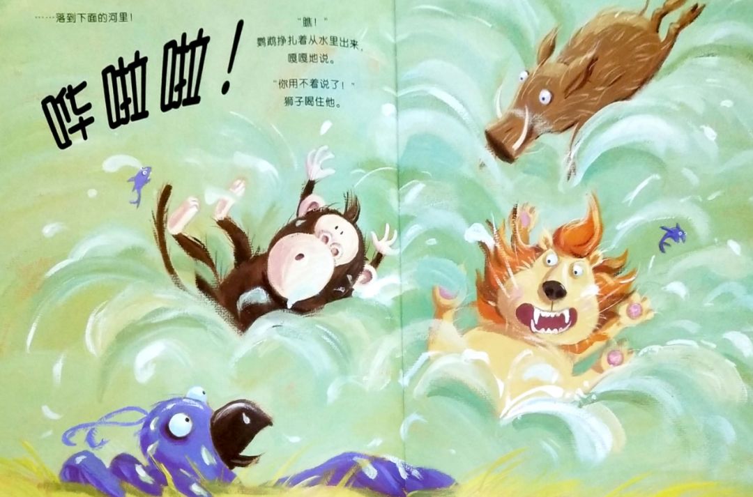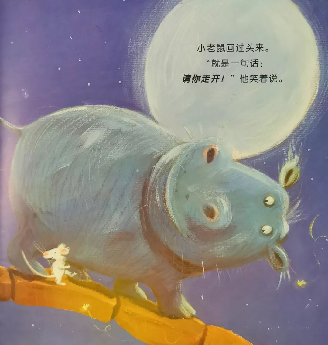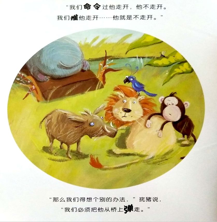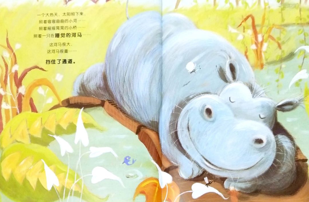 什么叫朗朗上口?读起来像唱歌似的好听就是了。有多个叠词、有重复的句式,有的甚至还押韵,这都是方便孩子学舌和记忆的语言。这样的语言孩子学得快、说得好。陪孩子读这些话,爸爸妈妈要结合故事情节,读得有趣一点、搞笑一点,让孩子忍不住跟着复述,多念一遍,他就记住了,甚至能学会活用。他对的不一定都整齐或者准确,不用太严苛地去挑剔和教导,让他享受语言的音乐性,大声说出来就好。孩子在阅读和游戏中感受到、体验过,并且学到了朗朗上口的语言,他就会用到生活中。一个说起话来像念诗一样动听的孩子,他的语言会令人非常舒服。在桥上睡觉的河马挡住了通道,森林之王狮子要过桥,就吼叫着命令河马走开,河马没有醒来。猴子想要过桥,就提议狮子和它一起推开河马,推不开。疣猪想要过桥,决定把河马从桥上弹走,所有参加弹河马的动物都掉进了水里,河马依然没有动。河马真的睡得这么沉吗?一只小老鼠在河马的的耳边吱吱了几声,河马就起身离开了。问问孩子:“河马刚刚真的睡得那么沉吗?”孩子会意识到,可不一定,它说不定是故意不起来,为什么会这样呢?带着孩子回看一下之前所有动物的言行:命令、推、弹,这让正在睡觉的河马感到舒服吗?这些语言都令河马不舒服,所以它不愿意配合大家。尤其生动形象的是,这本书里的文字都“动”了起来,粗鲁的语气词,夸张的动词,都用放大、扭曲等方式呈现了出来,让孩子看文字都能感受到粗鲁和不舒服。
