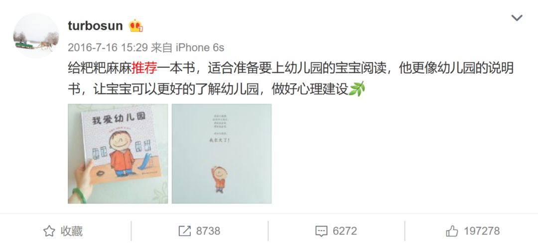 星二代总是多才多艺,现在很多明星爸妈都会在各大综艺或者社交平台分享自己的育儿心得。很多家长会说:“条条大路通罗马,明星家的宝宝,出生后就直接住在了‘罗马’,我们怎么能比呢?”其实啊,我们也不是完全不可企及。读书是成本最低的投资方式,也是每一个普通家庭可以承担的。明星们分享的好书,真的值得我们好好研究。娱乐圈的模范夫妻邓超和孙俪在家庭教育方面一直很有方法,两个孩子乖巧又可爱,时不时透出一些小顽皮。这也和他们的亲子共读氛围有很大关系,下面我们看看,他们都给孩子读哪些绘本吧~孩子到了三岁就要上幼儿园了,就要在新的幼儿园开展新生活了。在上幼儿园之前我们可以跟孩子读这本孙俪推荐的幼儿园说明书---《我爱幼儿园》,或许我们和孩子们阅读完这本书之后,孩子也会在上幼儿园的第一天因为害怕而哭泣。而书中的小莱昂说:“在幼儿园里,我有许多朋友,有时我会哭,有时我会笑,在幼儿园里,我长大了!”