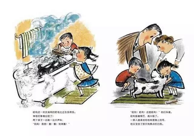 绘本的故事,和一般的文字故事不同,节奏感不同,且具有少字化的倾向。如果文字写满了,画家就没什么可画的了。另外绘本的特点是“以少少许胜多多许”。这本绘本,文字不多,故事很短,但有创意,有巧思。《好脏的哈利》被称为“世界绘本史上的里程碑力作”。但经典绘本的魅力并不限于此。吉恩· 蔡恩的文字活泼有趣、浅显易懂,而格雷厄姆的图画具有很强的用图说故事的能力。可以说,孩子的心事,哈利全懂。即使只看画面,孩子们也会被小“脏”狗哈利的有趣冒险逗得哈哈大笑。美国《学校图书馆》杂志称“即使是最挑剔的读者,也会被书中精妙的幽默,以及看似荒诞却又有真实之感的情节打动。”五十多年来,哈利一直畅销不衰,深受世界各国小朋友的喜爱,这正是图画书蕴含的奇特魅力与力量吧。