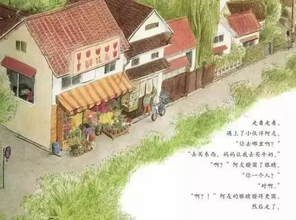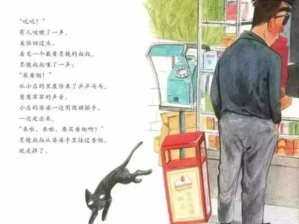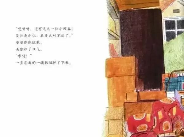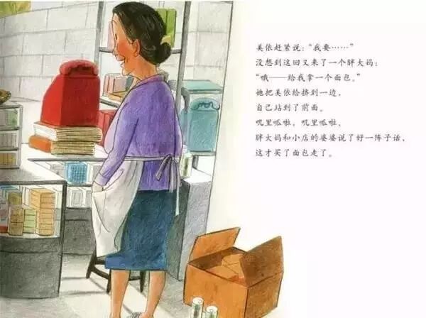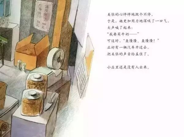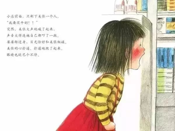 而婆婆也要走回里屋.这时,美伊大声喊了起来:“我要买牛奶!”“声音大得连她自己都吓了一跳”。婆婆转回身,这才发现了美伊这个小顾客,然后连连道歉。