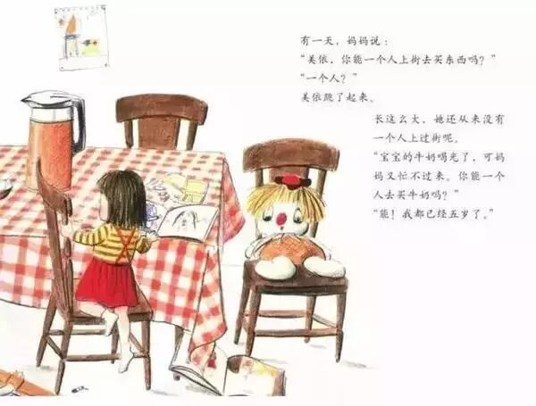 故事儿童文学就是故事文学。所以儿童文学不论是什么文体,都强调故事性。前面介绍、分析了《 第一次上街买东西 》的绘画的文学性,接下来我们看看这本绘本的文字故事的文学性,看看好故事长得是什么样子。作为写实故事,真实性是必然要求。一个五岁的幼儿一个人.上街买东西,妈妈一定会不放心。对美伊妈妈的不放心和嘱咐,作家不是直接交代,而是采取间接表现:“美伊答应妈妈做到两件事:一是小心路上的车子,二是别忘了找钱。”美伊把妈妈给的两个一百元硬币“紧紧地”攥在手心里出了家门。