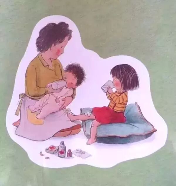 封底的画面是对整个故事做的一个有力的收尾——美伊克服种种困难,终于完成使命,大大的松了一口气。画面中,妈妈用美伊买来的牛奶喂小宝宝,美伊坐在妈妈身边,妈妈为她擦破的膝盖做了包扎,美伊一边喝着牛奶一边将一只脚搭在妈妈腿上,这个动作设计蕴含了作者对幼儿成长独特和深刻的理解。