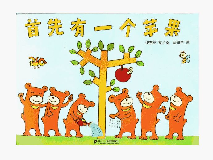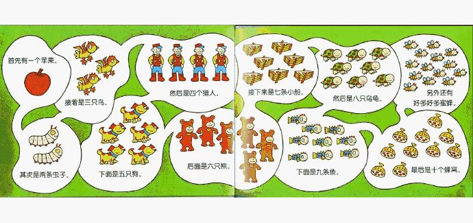 《首先有一个苹果》,这本绘本的作者很巧妙地把原本枯燥乏味的数字融入了形象生动的故事中,以一种既好玩又有趣的方式表达了数字的概念,符合孩子形象化的思维方式。无论在哪个画面中,苹果总是有一个、虫子总是有两条、小鸟总是有三只……孩子们能够很容易地通过寻找,将数字和形象结合起来,并随着情节发展不断巩固对数字概念的认识。