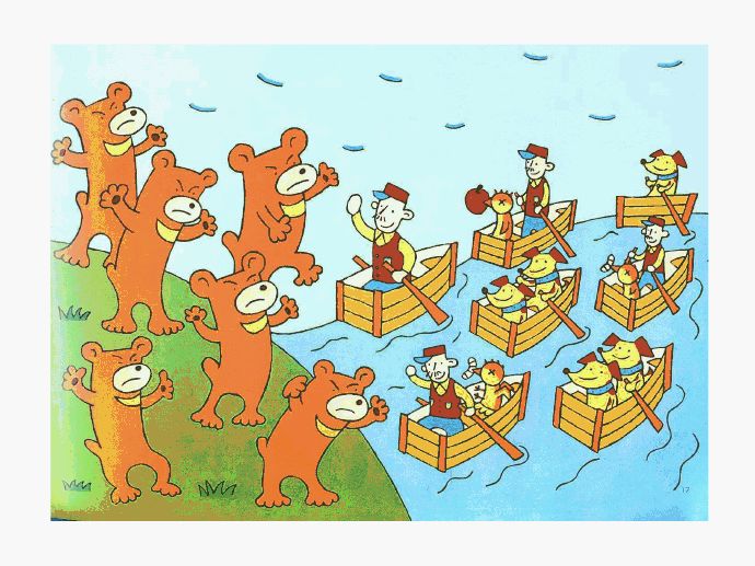 书中所有的角色都是以一定的数量和顺序出场:一个苹果,两条虫子,三只鸟,四个猎人,五只狗,六只熊,七条小船,八只乌龟,九条鱼,十个蜂窝,数不清的蜜蜂。除了一到十的数数,顺便还学习了简单加减,比如这张图: