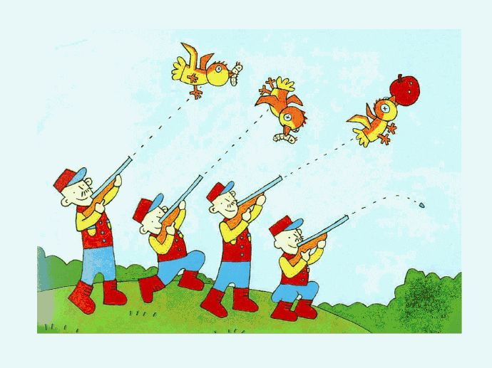 四个猎人举枪打三只鸟,可以看到有一发子弹打空了。三只鸟捉两条虫子,也看到会有一只鸟吃不到虫子。通过比较和隐含的数字逻辑,可以启发孩子想一想:如果只有三个猎人,或者有四只鸟,会出现什么样的结果呢?