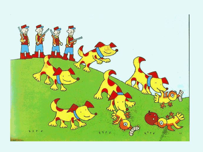 其实这本绘本不止于简单的数量的认识,你看,三只鸟追两条虫子,四个猎人打三只鸟……不断推进的故事情节背后隐藏着最简单的比较和加减的概念。