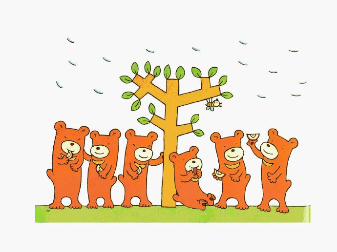 那么故事到最后,细心的孩子会发现,封底是6只小熊在分6瓣苹果吃,为什么是小熊最后吃到了苹果呢?我们可以引导孩子在扉页上注意这样一个细节,一只熊正在用喷壶浇灌着苹果树,另一只熊似乎是正在撒播肥料。而其他的六只熊,抬头望着树上的苹果,似乎都流露出了对收成的憧憬。而在封底,它们费尽千辛万苦终于追回了苹果,开心的齐聚在苹果树下,分享了自己得来不易的劳动果实。所以,这说明这个苹果树是6只小熊种的,这是小熊的苹果,这也培养了孩子的逻辑思维。凡事有因有果,因为六只熊为苹果付出了劳动,所以它们要去追猎人,去拿回自己的劳动果实。