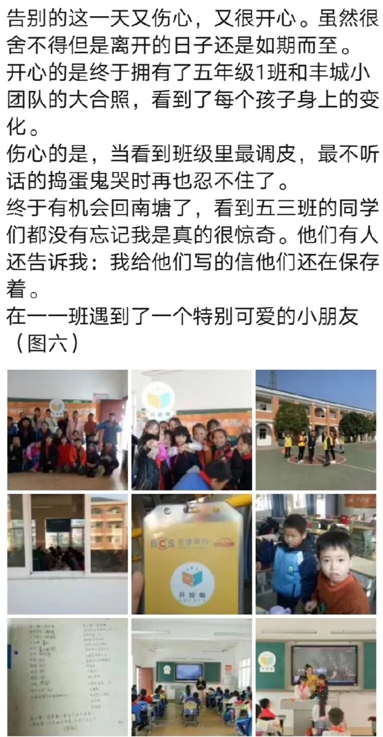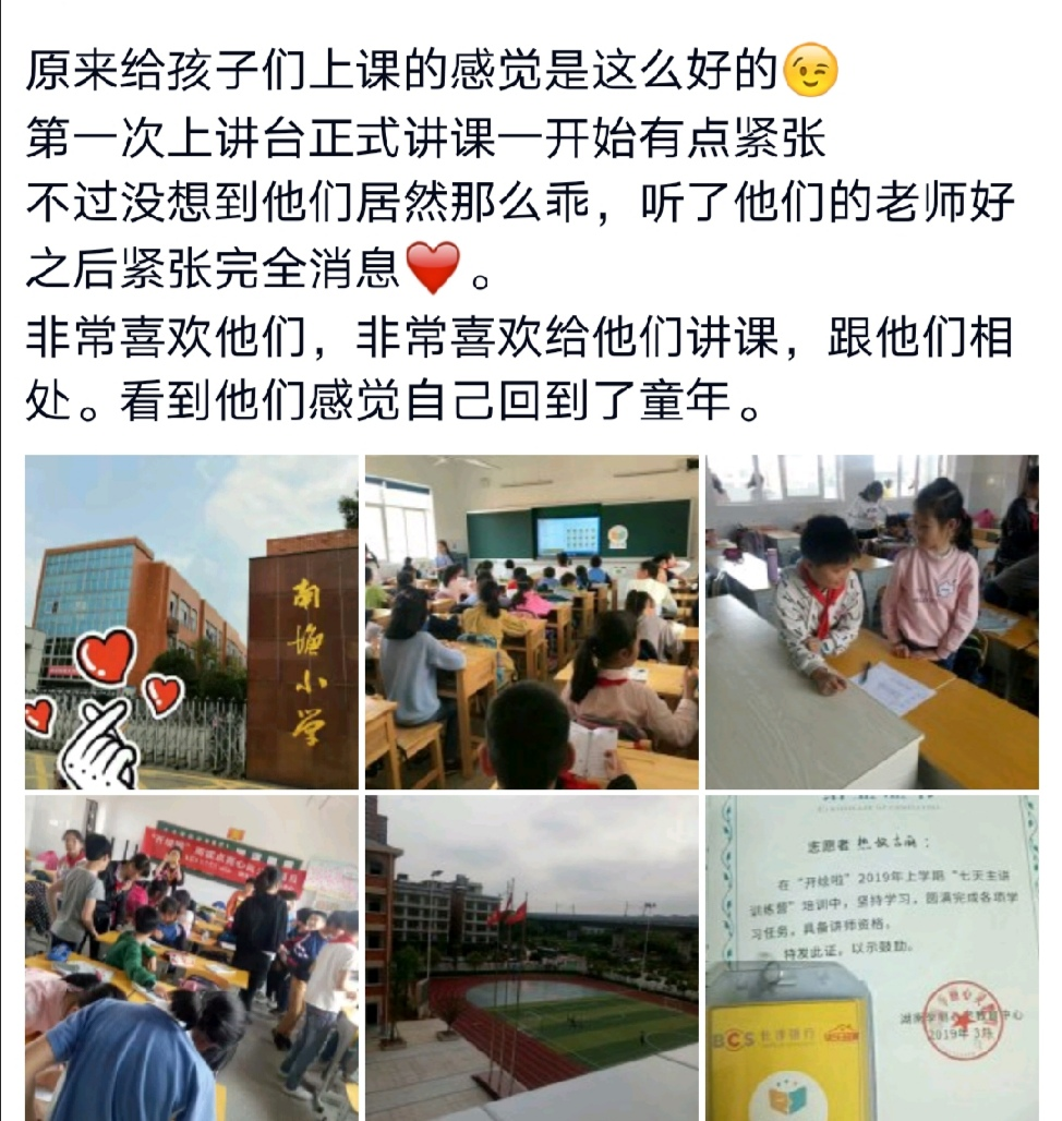 2019年4月1日,这是我在开绘啦上课的第一天。这天分享的绘本是“神奇飞书”,一本关于阅读的故事。前天晚上我根本睡不着,想到明天就要上课了,既激动,又害怕。那天一开始我非常的忐忑,紧张,怕自己上不好,怕不被孩子们不喜欢,更怕成为一个自己都讨厌的老师。但是当我真正的站上了讲台,看到了孩子们天真无邪的眼神,教师的责任感和课堂的仪式感在心中油然而生。孩子们很乖,很喜欢这堂课,整节课都非常顺利,最重要的5(三) 班的孩子们给了我希望。后来的三周我们相处的非常好。我的担心统统消失,取而代之的是对他们的爱。从此每周二都成为了我最期待的日子。 后来我大三,他们六年级了。我还在心里默默的想念他们,没想到他们也没忘记我。后来我去看望他们的时候,他们特别开心,让我写下了给他们的祝福。也是那天,我喜欢上了“温柔”这个词。因为他们觉得我“温柔”。 每个人都有自己非常热爱,喜欢到舍不得放手的事情,这对我来说就是来开绘啦见孩子们! 第二学期的开绘啦服务也如期而至,出于对它的热爱,我不顾一切留了下来。 丰城是一个农村小学,每个班级人数很少,但是同学们对开绘啦的热爱一点都不亚于其它学校的孩子。他们热情很高,很会配合老师。当然也有一两个“问题”孩子。讲到有趣的部分我们一起哈哈大笑,讲到感人的部分我们都偷偷流泪,遇到问题我们一起解决。在这种氛围之中每一个四十分钟显得非常短暂。 五一班有一个“问题”孩子。上课问东答西,爱搞怪,捣乱,迟到。当最后一节课,我给了他们写给每个人的信,准备走的时候他哭了,哭的很厉害。下课之后他跑出来问我“你还会来吗?”。这个时侯我明白,原来世界上并没有所谓坏学生,无论他们是多大年纪,都有分辨善恶的能力。他们不会故意伤害一个好老师,只是他们表现的方式不一样而已。 值得一提的是,这个学期丰城小学的团队人数是各个小学中最少的。只有5位讲师,1位摄影和1位文案,但是我相信我们一定是最和谐最棒的。我们平时互相监督,一起备课。每次周二结伴去学校上课。课余时间也会互相评价给出建议,互相学习。表彰大会上,大家集思广益演出了一个非常棒的节目“丰城disco”。虽然我们没能拿到优秀团队的奖项,但我们知道我们是很优秀的。在后来的日子,团队里结识的伙伴们也都成为了大学生涯的好朋友。 去到北塘是疫情之后的大四上学期,这时很多人劝我好好考虑,“已经大四了没多长时间了,该把重点放在学习和找工作上”之类的话在我耳边飞来飞去。很多人觉得我学习的是工科,未来的工作也应该跟专业相关,参与开绘啦的服务就算再好对我就业也没什么帮助。但是他们不知道的是,我已经在开绘啦找到了我的目标,我知道了自己想要什么。我再也不是以前的迷茫青年了。 在开绘啦的第三个学期,我走上讲台时很自满,觉得自己一定可以hold 住课堂。但是,第一堂课让我知道我错了。低年级和高年级完全不一样。即使如此,面对课堂上发生的意外状况我从来没有怪过孩子们。开绘啦的伙伴们说过,“老师好好学习,学生天天向上”。我知道只要我勤奋,努力,反思,课堂会越来越好。果不其然,我们一起变得越来越好了,课堂上的问题越来越少。 在这里我遇到了另一位“可爱小孩儿”。一开始,课堂上老师的问题他不太愿意回答,活动课参与度有待提高,可他也有自己的闪光点。他做事非常积极,经常帮老师贴横幅、撕胶带和收横幅,下课出去之前还会微笑着跟我说一声“老师再见”。“奶奶的护身符”的活动课中他格外积极。他做了三个护身符,把两个送给了助教老师和我,他说“剩下这个是送给妈妈的”。最后一节课拍照的时候他还拉着我的手。我知道他不仅可爱,还非常礼貌和善良。 这个学期非常的遗憾,由于实习,我与开绘啦的服务失之交臂。但是就像雪金说“开绘啦是非常包容的”。我实习结束之后,开绘啦又给了我机会,让我可以跟小伙伴们一起去丰城看我的五一班(现在是六一班),还可以去观摩学习其他志愿者上课。 如果说在大学我的爱分成了三份,一份给了学业,一份给了爱好,而另一份就给了开绘啦。对我来说,这里的每一分钟都非常珍贵,这里的每一个人都是我的知己,这里的每一个学生都是我的孩子。非常感谢开绘啦给了我成为讲师的机会,感谢每一位小伙伴和我一起成长,感谢每一个孩子!如果还有机会我愿意继续留在开绘啦!因为我对他的热爱从未减少! 作者 | 热孜古丽 编辑 | 曾晨璐 认识我们 “开绘啦”阅读点亮心灵公益项目 项目资助方 长沙市长沙银行快乐益家慈善基金会 项目运营方 湖南李丽心灵教育中心,由2007年度“感动中国”人物李丽创办。2010年9月在湖南省民政厅注册成立,机构秉承“让更多的人心灵富有”的使命,以及“治未病”的工作理念,通过深入学校和社区常态化的开展社会工作服务,帮助青少年群体特别是孤儿、留守儿童、农民工子女和所谓的“问题”孩子心理补钙,助其实现心灵的富有,倡导让“心理扶贫”成为新常态。机构先后荣获“民政部首批企业社会工作试点单位”、“全国先进社会组织”、“全国百强社会工作服务机构”和“第三届湖南慈善奖”。 点击下方链接获取更多“开绘”信息 全国先进社会组织 全国百强社会工作服务机构