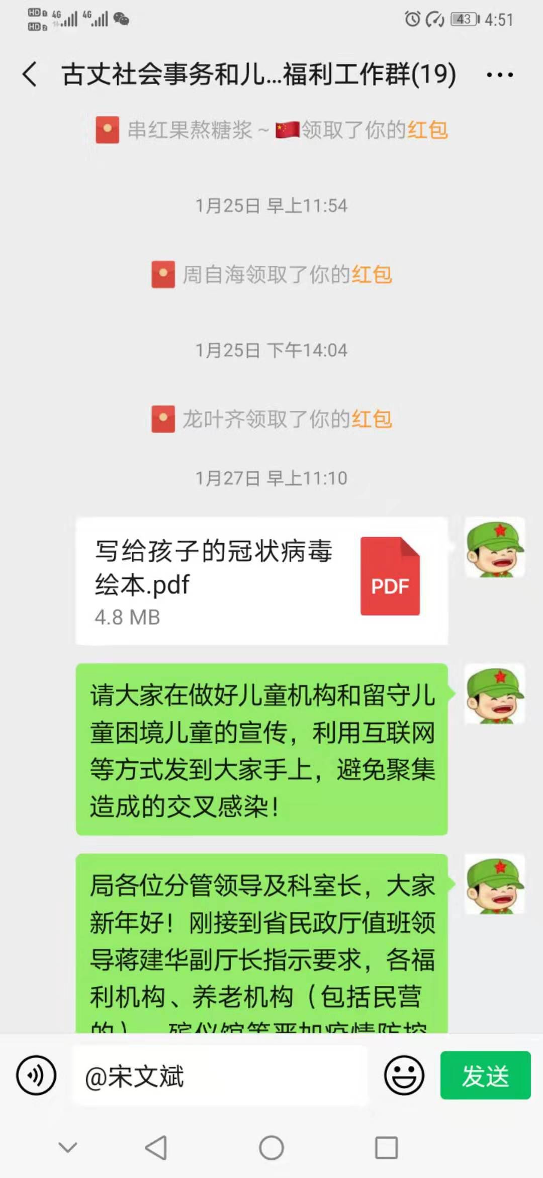 三“讲”——开展最通俗的防疫知识科普。通过微信群、电子屏幕宣讲新型冠状病毒感染的肺炎防疫知识,引导儿童福利机构职工、儿童掌握了解新型冠状病毒预防知识,科学防控,及时疏导紧张、焦虑等情绪。利用微信群及时将新型冠状病毒绘本发放到各级民政部门、儿童督导员、儿童主任手上,及时宣传科学防控知识,切实增强困境儿童和留守儿童自我防护意识。