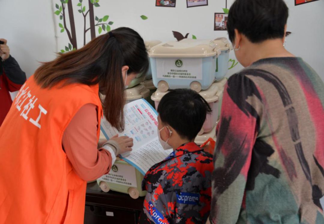 每个“爱心防疫包”内含一次性医用口罩 20 个、 免洗洗手液 1 瓶、湿纸巾 1 包、抽纸 1 包、牛奶 2 盒、防疫宣传单 1 张、暖心鼓励卡1张。在“防疫包”发放过程中,社工耐心细致地向困境儿童宣传防疫知识,演示正确佩戴口罩方法,为未戴口罩的孩子戴上口罩,并详细了解困境儿童的近况,针对个别有需求的困境儿童还将提供疫情期间心理情绪疏导等服务,做好困境儿童的身体健康防护与心理关爱保护工作。