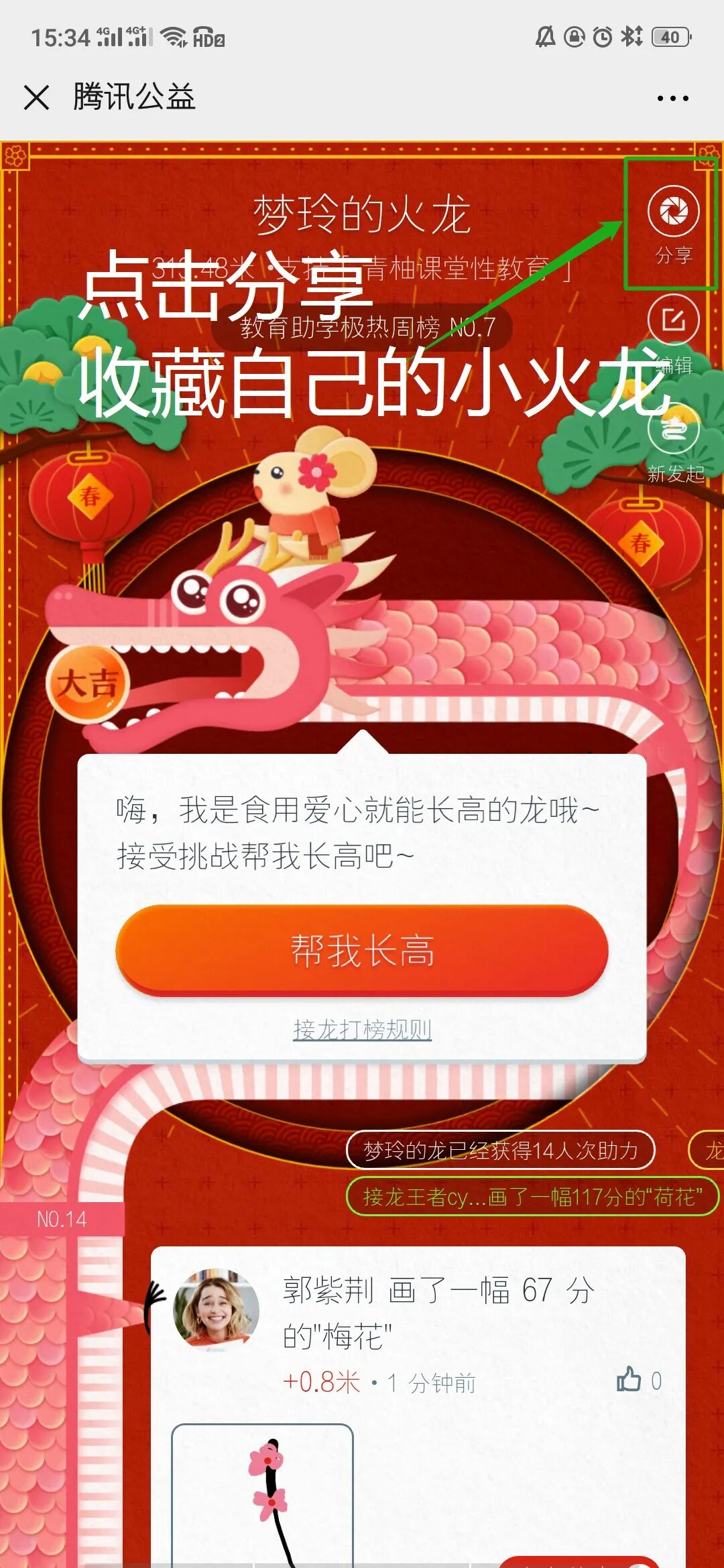 点击右上角“分享”收藏自己的小火龙,转发给朋友们点击“帮我长高”。