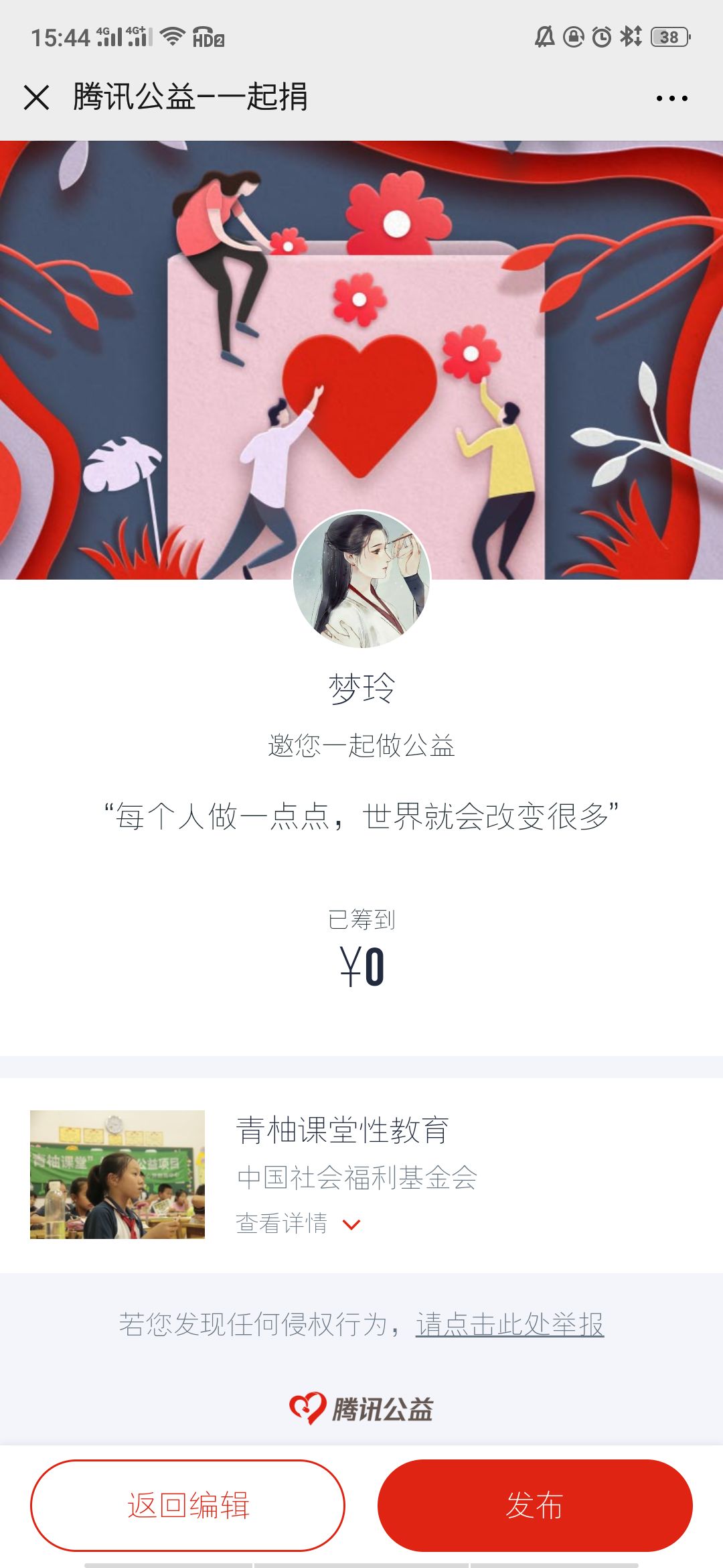 点击“发布”即可发送给朋友累计“一起捐”参与人数。